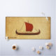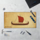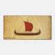 A Viking long ship with a red sail seen in profile from the right side and superimposed on an old paper background image. Customize by adding your own text.