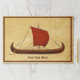 A Viking long ship with a red sail seen in profile from the right side and superimposed on an old paper background image. Customize by adding your own text. You may change both the text font and color. You may also change the color of the border or remove it altogether.