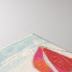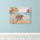 Sailboat with red sails, sailing on choppy ocean water alongside a beach with whimsical palm trees in foreground, a mixed media work of art.