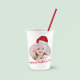 A cute Christmas paper cup party supplies, with a photo template, and red and white Santa hat illustration, with a stylish calligraphy script, and whimsical typography, a simple minimalist style perfect for holiday parties, and whimsy Xmas celebrations, a classy minimal traditional style.