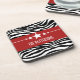 Trendy and modern Sassy Star Zebra Coaster Set featuring a chic black and white zebra print background and a bold red border adorned with a fun star motif. This girly design may be customized with the personalized text of your choosing. Click "Customize It" to find more personalization options.