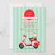A zippy design for a birthday celebration. The striped background features a red banner header and a red and white scooter with a birthday cupcake. The cupcake can be dragged to any location or eliminated.