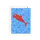 A red color shark cartoon on a blue patterned background. The shark and blue pattern are a printed design, it is not a raised or textured design.