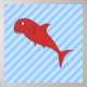 A red shark cartoon on blue stripes. A fun animal cartoon design.