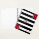 This elegant design features vintage red and silver floral bouquets in two corners on a trendy black-and-white striped background. Personalize it with your initial in red serif font and your name in black handwriting script.