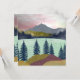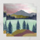 This gorgeous abstract landscape depicts a mountain scene with a lake and a multi color sky in shades of red, cyan, blue, yellow and gold.