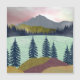 This gorgeous abstract landscape depicts a mountain scene with a lake and a multi color sky in shades of red, cyan, blue, yellow and gold.
