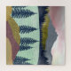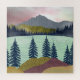 This gorgeous abstract landscape depicts a mountain scene with a lake and a multi color sky in shades of red, cyan, blue, yellow and gold.
