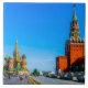 Red Square of Moscow in the summer evening. Red wall of the Kremlin (right), Spassky (Savior's) tower (right) and St. Basil's cathedral (left). Soviet era viewing stand (right) to watch civilian and military parades.