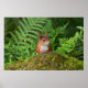 A curious red squirrel peeks from behind a moss-covered rock in a serene, forested scene. The vibrant green of the moss contrasts beautifully with the squirrel's russet fur, creating a picturesque moment of nature’s hidden wonders.