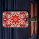This travel tag features a a bright red and mixed colours, star burst style mandala design that I created from a photograph of a bale of mixed silk materials. The colours will brighten up your luggage and be clearly visible from a distance.