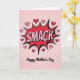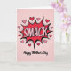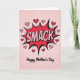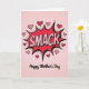 This card features a comic-style illustration with a large crimson-red starburst shape outlined in black and dotted with tiny halftone-style specks. Centered inside the burst, the word “SMACK” appears in soft pink, set in chunky uppercase letters that feel like a cheeky kiss ❤️. Around the starburst, several heart shapes swirl like they’re caught in a happy spin, some filled in deep red and others in pale pink with thin black outlines. The background is a gentle pastel pink field sprinkled with lighter pink polka dots, giving the scene a sweet, cozy setting. Near the bottom, the message “Happy Mother’s Day” is written in flowing black lettering that stands out clearly against the pink backdrop 🌼. The layout keeps the big kiss-word front and center while the hearts drift outward, like affection rippling through the air between close loved ones. The starburst sits above the lower text, with open space between them so the design feels balanced rather than crowded. Small hearts of mixed sizes cluster mostly around the burst, with a few floating farther out against the dotted pink background.