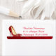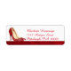 Chic girly return address label done in white, with graphics of a red ribbon, across the bottom and red glitter looking stiletto high heels, on the left. Personalize the red text with your information.