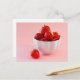 This postcard features a vibrant, high-quality photo by Destei of ripe red strawberries in a white bowl, set against a blush pink background. Simple and striking, the image captures the natural beauty of fresh fruit with a modern, minimal touch.