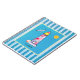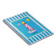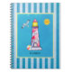 Spiral notebook with a nautical theme. Designed with a red striped lighthouse and a beach ball. A smiling sun and flying seagull off in the distance. The background has a blue striped pattern with a blue watercolor frame with a yellow border layered over top. Personalize with a name or other text.