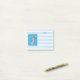 Sticky notes with a nautical theme. Designed with a blue striped pattern and a blue frame with a yellow border layered over top. A red striped lighthouse and a beach ball, and a smiling sun and flying seagull off in the distance positioned inside the frame.