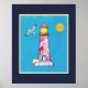 A poster with a nautical theme. Dark blue background with a light blue frame layered over top. Positioned inside the frame is a red striped lighthouse and a beach ball, and a smiling sun and flying seagull off in the distance.