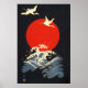 RED SUN ,JAPANESE FLYING CRANES,SEA WAVES IN BLACK POSTER