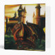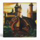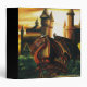 This dramatic fantasy artwork showcases a powerful red dragon perched before an ancient castle under a fiery sunset sky. Rich golden light, detailed scales, gothic towers, and lush greenery create an epic medieval atmosphere perfect for dragon lovers and fantasy enthusiasts and this striking illustration brings a bold mythical presence to any product.