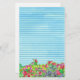 A pretty floral blue lined stationery featuring soft red sweet peas mingling with purple lupines and mauve everlastings drawn with ink and painted with watercolor.