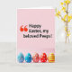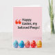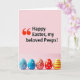 This card features a cheerful spring-holiday layout with a soft pink background that fades gently from top to bottom 🌷. The upper two-thirds are filled with a large greeting in black lettering, introduced by an oversized red quotation mark near the left side. The message is arranged in stacked lines, giving it a friendly, conversational look, as if it’s being said directly to close friends. The warm pink gradient behind the words adds a tender, affectionate tone without needing extra decoration. Along the bottom third, five decorated oval eggs sit in a neat horizontal row, like a shared display set out for loved ones. Each egg mixes blue, red, yellow, and white, using swirls, dots, and stripes that feel coordinated but not identical 🐰. The eggs include blue and red curling lines, small white polka dots, and bright red striping across their glossy shapes.