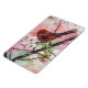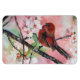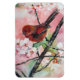 Oil painting representing a beautiful small red bird singing on a blooming cherry tree in springtime.