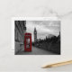 Postcard of a selective color photo of a red telephone box in the city center of London, UK with the Big Ben in the background on Remembrance Day with the tekst: 'London'.
