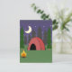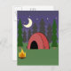 A birthday postcard invitation featuring an illustration of a red tent in the woods at night with a camp fire. Personalize all text.