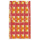 This gift bag has a geometric design of L's in red, orange, and yellow, placed in different directions on a field of white.