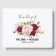 This red tropical and romantic wedding guest book is perfect for a red wedding. The artistic bordo marsala design features watercolor, green, pink, burgundy and blush roses assorted with greenery neatly arranged in a graceful and radiant flower bouquet. Customize the front cover to include the names of the bride and groom and the wedding date.