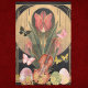 This art deco style design features a stylized red tulip encircled by a wooden circle or moon against a black background. A whimsical fiddle rests up against the design. Easter eggs in dark peach and green-gold stripes and butterflies enhance this page, which has a junk journal feel.