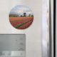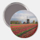 Round photo magnet of a spring landscape with a field with red tulips and other flowers and a windmill during sunrise in the Keukenhof gardens, Bulb Region, the Netherlands.