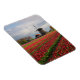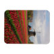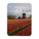 Vertical souvenir photo magnet with a spring landscape with a field with red tulips and other flowers and a windmill during sunrise in the Keukenhof gardens, Bulb Region, the Netherlands.