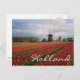 Postcard of a spring landscape with a field with red tulips and other flowers and a windmill during sunrise in the Keukenhof gardens, Bulb Region, the Netherlands with the text 'Holland'.
