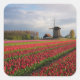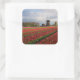 Photo sticker with a spring landscape with a field with red tulips and other flowers and a windmill during sunrise in the Keukenhof gardens, Bulb Region, the Netherlands.