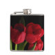A bouquet of scarlet red tulip flowers and green leaves set on a pure black background grace this gorgeous floral hip flask.