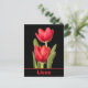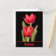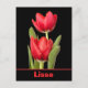 This postcard from Lisse, The Netherlands features two beautiful red tulips with green leaves over a black background. The location of 'Haarlem' can be easily changed to your requirements using the handy template function available on this postcard