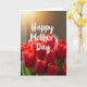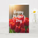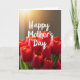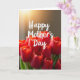 This design shows a dense bouquet of red tulips filling the lower two-thirds of the scene, their velvety petals leaning close together like friends sharing a quiet secret ❤️. Warm light pours in from the upper left, backlighting the blooms so their edges glow and their inner tones shift from deep crimson to hints of orange. The petals show fine textures and gentle ripples, with a few sunlit rims that feel like a soft touch. Above the flowers, the greeting “Happy Mother’s Day” appears near the top center in white lettering that flows lightly against the background 🌼. The background stays softly out of focus, fading from bright amber near the top into a muted earthy taupe below, creating a calm halo around the text. The overall layout keeps the words airy and open while the flowers gather below, suggesting closeness and affection without needing any characters. A subtle gradient and diffused glow frame the tulips, with the brightest highlight lingering at the upper left edge of the bouquet.