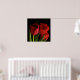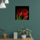 This gorgeous poster features a bouquet of scarlet red tulips and green leaves set on a pure black background.