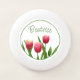 This Wham-O frisbee features a green scripted name over a set of red tulips flowers with an inset circular dark green border.
