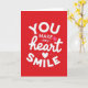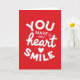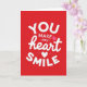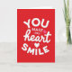 This Valentine's Day card features a bright red background with the message “YOU MAKE MY HEART SMILE” in white across the center. “YOU” sits near the top in large, slanted, all-caps letters, and “SMILE” appears near the bottom in the same strong style. The word “MAKE MY” is smaller and tucked between them, keeping the layout tight and easy to read. “HEART” is written in a smooth, flowing white style across the middle, and a small pink heart shape sits inside that word. Near the lower area, there’s a small white heart with a few tiny white dots around it, like little sparks of happiness. The overall look feels warm, sweet, and full of affection—perfect for someone who makes you grin 💕❤️. Share it with someone special and spread the love this Valentine’s Day.