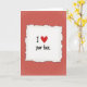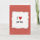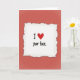 This greeting card features a white rectangle in the center that looks like a piece of torn paper, with uneven edges and a thin black outline. Behind it is a deep red background filled with diagonal reddish-orange strokes that feel like crayon or colored pencil marks. In the middle of the white area, the text reads “I ❤️ your face.” with the “I” in simple block lettering. The heart is drawn in red and looks slightly uneven, like it was sketched by hand, which makes it feel personal ❤️. The words “your face.” appear after the heart in a loose, casual script, all on one line. The overall look is sweet, direct, and affectionate, like a quick note you’d leave for someone you care about 💌