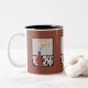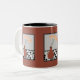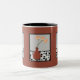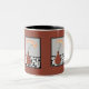Paneled with a mixed media image of a still life, this mug is a little piece of art that you can enjoy with your coffee or tea. The still life depicts three orange Daylilies in a brick red, bulb-shaped vase. The vase sits on a tabletop covered with irregular tiles in black, light gray, medium gray and white. The wall behind is light gray. The edge of the image is beveled giving it a dimensional effect that makes it itself look like a tile within a wide, brick red leather-look mat. This design can be used on any of a number of different mugs, glasses and steins.