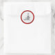 A contemporary, round red and white envelope seal featuring a black, swirling decoration in the middle and a lush, red velvet-effect border around the edge.