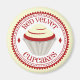 A magnet featuring an illustration of a red velvet cupcake with white icing inside a decorative red and white circle with red text.