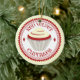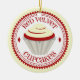 An ornament featuring an illustration of a red velvet cupcake with white icing inside a decorative red and white circle with red text.