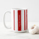 Red vertical stripes with your name personalized mug. Set of three red striped panels with white text name field at center stripe on a white background.