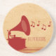 Quirky and unique Vintage Gramophone Sandstone Coaster in dark red featuring a silhouette of an old-fashioned gramophone and a cascade of musical notes on a digital art rendered paper background. This chic sandstone coaster will protect your furniture with vintage flair and is perfect for any music lover. Easy to customize, simply personalize with the text of your choosing. Click on the "Customize It" button to find additional personalization options.
