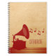 Quirky and unique Vintage Gramophone Notebook in dark red featuring a silhouette of an old-fashioned gramophone and a cascade of musical notes on a digital art rendered paper background. This chic custom notebook will keep your notes and thoughts together with vintage flair and is perfect for any music lover. Easy to customize, simply personalize with the text of your choosing. Click on the "Customize It" button to find additional personalization options.