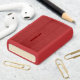 It's a cool image of red vintage leather texture with a stitched effect and a customizable monogram—a simple, minimalistic design.